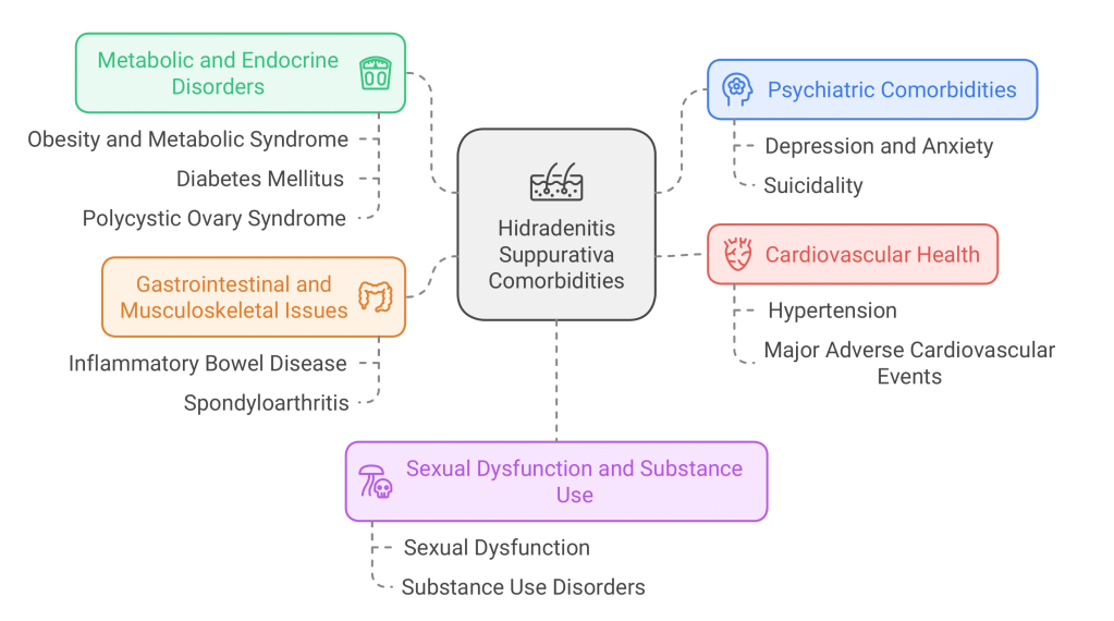 - Diabetes Mellitus (DM): The risk of DM is elevated in HS patients, with prevalences reaching up to 24.8%. Screening for diabetes is crucial for comprehensive HS management.